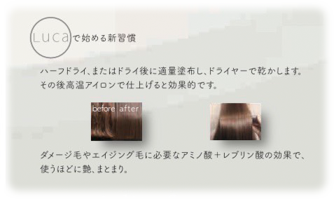 毛髪内部に栄養剤を届け、毛髪外部を疏水化する効能で 熱耐性を上げて栄養素の流出を防ぎ、 手触りの良い艶髪の持続力が底上げされます。