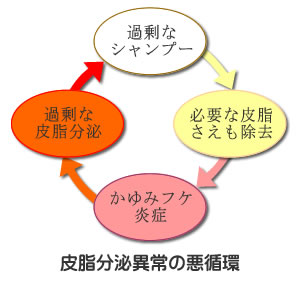 皮脂は頭皮を保護する働きもあるのですが、洗浄力の強いシャンプーで洗浄すると、頭皮のバリア機能である皮脂を除去し過ぎてしまい、頭皮が乾燥し、結果、外的刺激から頭皮を守ろうとして皮脂を過剰に分泌させてしまいます。